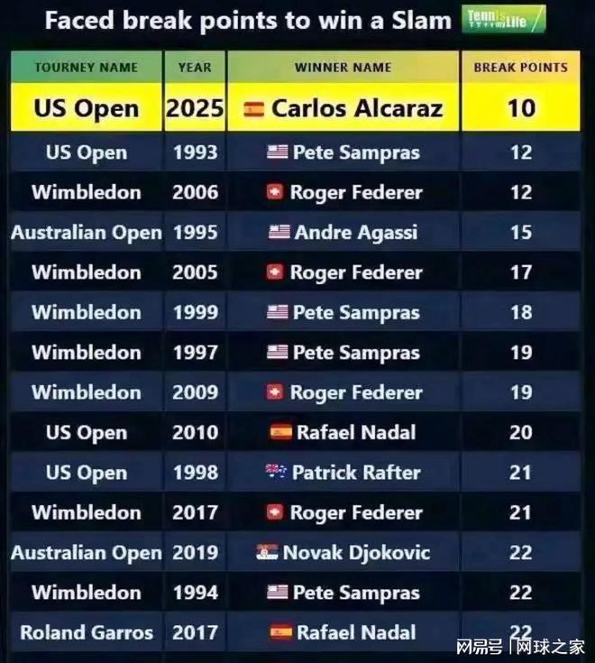 在阿卡之前,并列排在第一的是1993年的桑神和2006年的费牛,两人在各自的后花园美网和温网,整届赛事下来,均只给予对手12个破发点。