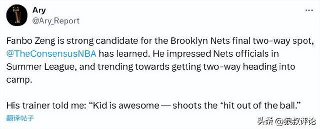 北京时间9月16日,据美国记者Ary:曾凡博是篮网最后一个双向名额的有力候选人,他在夏季联赛中的表现令篮网管理层印象深刻,随着训练营临近,他获得双向合同的趋势日益明显。