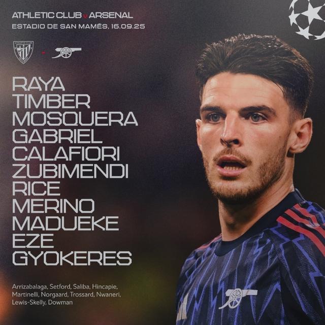 09月16日讯 欧冠联赛阶段第1轮,毕尔巴鄂竞技主场迎战阿森纳,赛前首发名单公布。本场比赛厄德高、萨卡、哈弗茨、本-怀特因伤缺战,新援约克雷斯、埃泽、马杜埃凯出战,萨利巴回归坐镇替补。