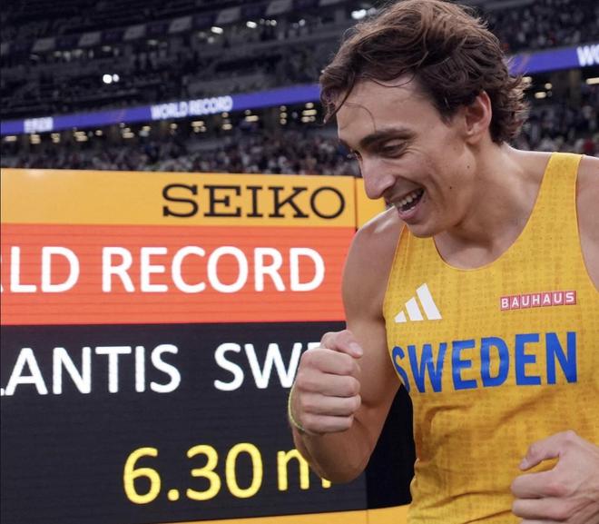 2025东京田径世锦赛男子撑竿跳高决赛。世界纪录保持者杜普兰蒂斯成功越过6米30的高度,再次刷新自己保持的男子撑竿跳高世界纪录并夺冠。