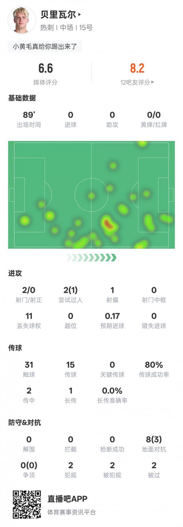 全场比赛,贝里瓦尔2次射门0射正,1次过人成功,8次地面对抗3次成功,有11次丢失球权。