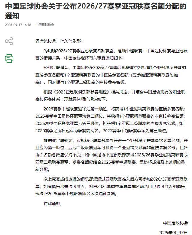 名额1!202627赛季亚冠名额分配,中超1+1+1,中超冠军第一顺位,足协杯冠军第二顺位