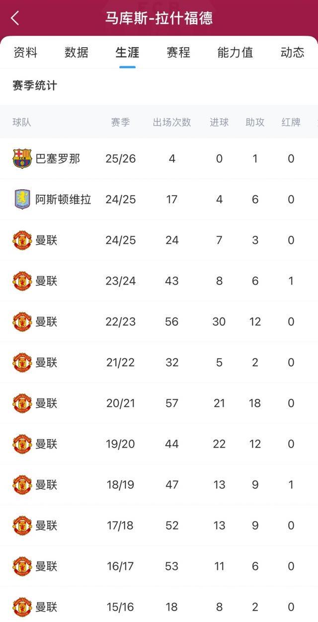 拉什福德近两个赛季表现不佳,上赛季被曼联租借至维拉,今夏再次被外租至巴萨。