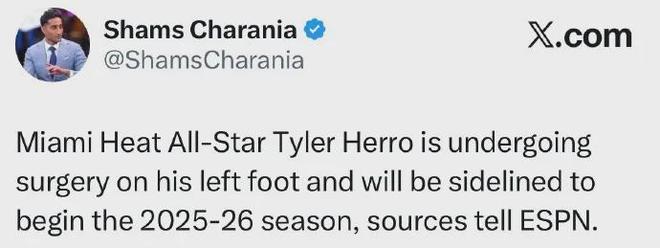 爆料王Shams:希罗接受了左脚手术,将缺席新赛季的初期比赛。
