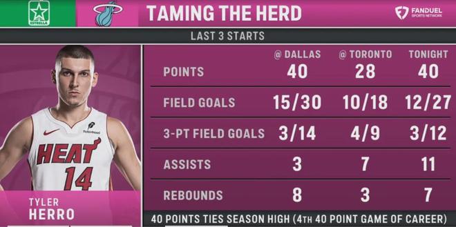 上赛季巴特勒被交易到勇士之后,希罗成为了热火新老大,出战77场常规赛全部首发,场均亮相35.4分钟,贡献23.9分5.2板5.5助,三项命中率47.2%、37.5%和87.8%;季后赛则场均出战36分钟,得到17.8分3.5板2.8助,三项命中率41.5%、31%和80%。