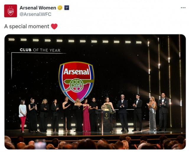 9月23日讯 阿森纳女足官方更新社媒动态,晒出金球奖最佳女足俱乐部的领奖照片。