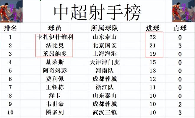 射手榜方面,卡扎伊什维利22球领跑,法比奥昨晚上演帽子戏法后追了上来,差1球位列第2。莱昂纳多梅开二度后19球位列第3,基莱斯15球排在第4。泽卡,韦世豪,图多列10球刚好挤入前十。