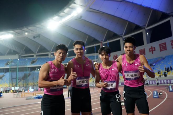 由苏炳添、严海滨、丘智贤和林健豪(从左到右)组成的广东队以38秒60的成绩获得小组头名并打破广东省纪录。