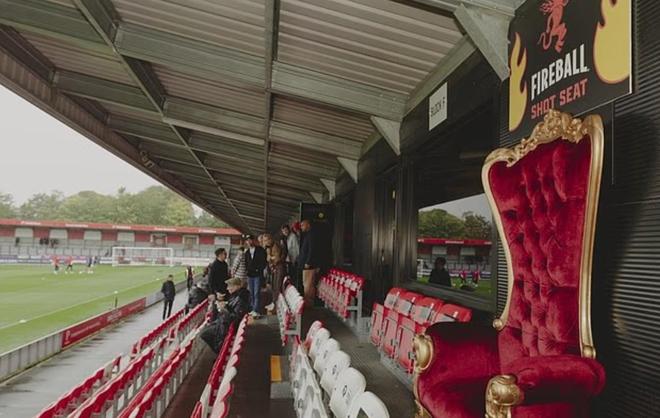 这场比赛,索尔福德城主场还提供了一个特殊的座位,名为射门座椅,这个创意由火球威士忌提出,球迷们可以一边享用注入火球威士忌的精致派,一边在中场休息时品尝冰镇烈酒。