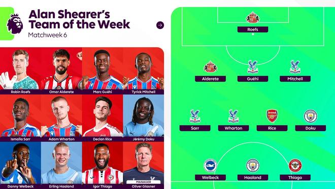 英超官方发布了阿兰-希勒评选的英超第6轮最佳阵容,哈兰德领衔,维尔贝克、格伊、赖斯在列。