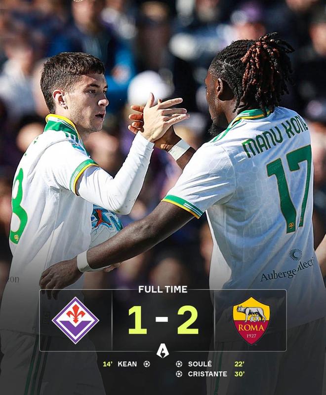 红狼客场对阵佛罗伦萨,他们先丢一球,随后连扳2球笑到最后,比赛仅仅开打13分钟,佛罗伦萨前锋基恩轰出一脚世界波打破僵局,罗马0-1落后;仅仅过了7分钟,罗马便还以颜色,小将苏莱在禁区外一脚远射将比分扳成1-1平手;第29分钟,克里斯坦特在角球进攻中头槌建功,帮助罗马2-1反超对手;随后主队佛罗伦萨疯狂反扑,但是面对红狼钢铁般的防守却无可奈何,最终在主场1-2不敌对手,目送罗马豪取3连胜,积分上升到15分,与那不勒斯并列榜首。值得一提的是,加斯佩里尼的球队6轮仅丢2球,不仅是意甲丢球最少的球队,更是同一时期五大联赛最强钢铁防线。