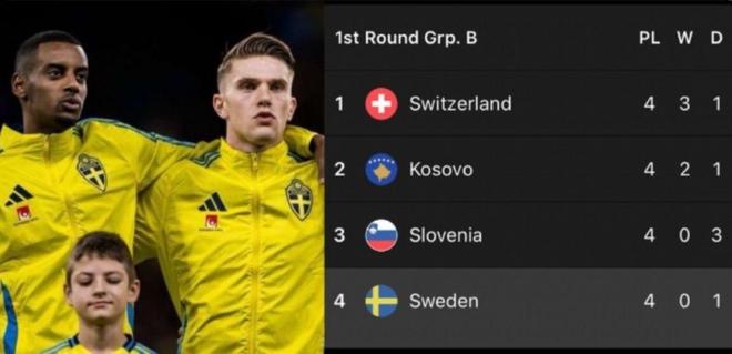 4轮比赛结束后,瑞典队一场没赢,只拿到1个积分,小组垫底,落后第1名瑞士9分,落后第2名科索沃6分,落后第3名斯洛文尼亚2分。目前,瑞典已经确定无缘小组第1,无法直接晋级世界杯。