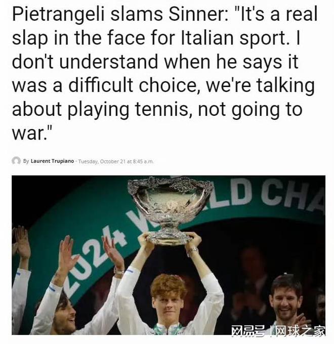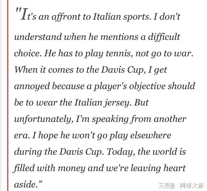 皮耶特朗格利通过安莎社发表声明,表达了他的不解与愤怒:“我不明白当他说这是一个艰难的选择时,我们谈论的是打网球,而不是开战。对于戴维斯杯,这是至高无上的荣誉,任何运动员的目标是身披蓝色球衣。”