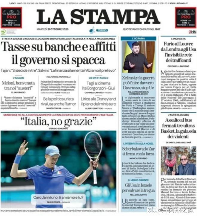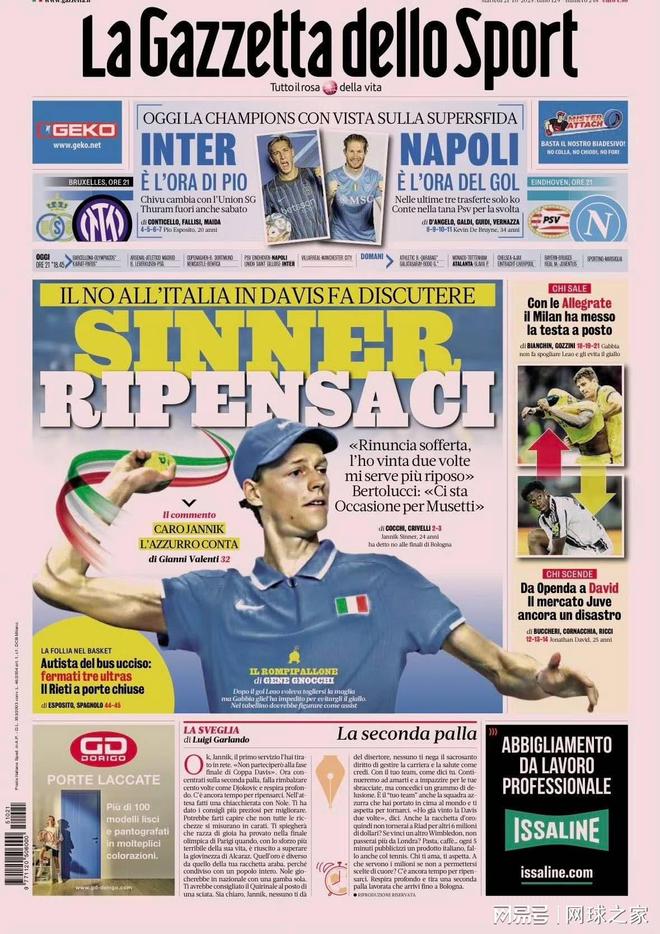 意大利网球名将辛纳日前宣布,将不参加于11月18日至23日在博洛尼亚举行的戴维斯杯决赛圈比赛,这一决定在意大利网坛引发巨大争议。