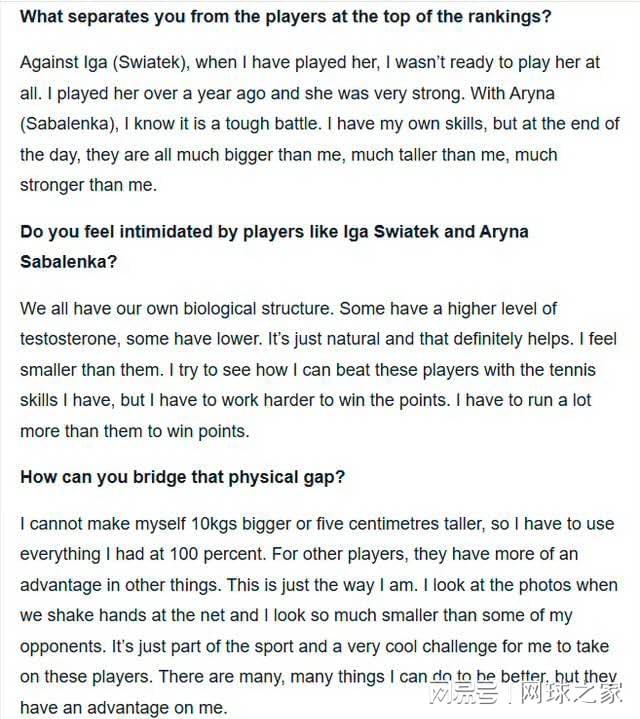 还有网友表示,“事实上,在WTA巡回赛中,身高各异的选手都有成功先例。现任世界前十中,保利尼身高仅1.63米,但她仍高居排名前列,而且还在刚刚不久前击败了斯瓦泰克,这一例子更让她的言论觉得讽刺!”