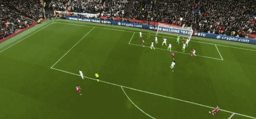 第9分钟,维尔茨前场积极逼抢,从赫伊森脚下断球,索博斯洛伊传球,麦卡利斯特在卡马文加的干扰下,放了高射炮。