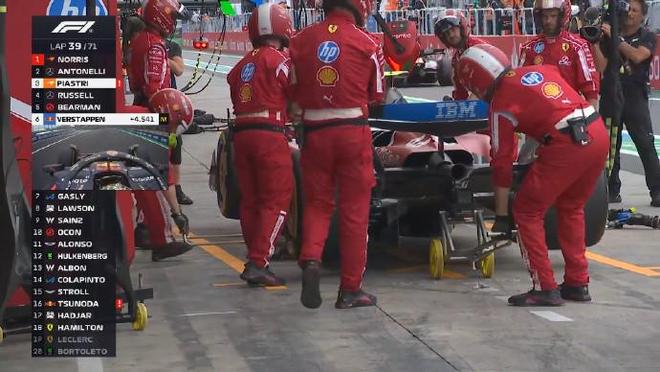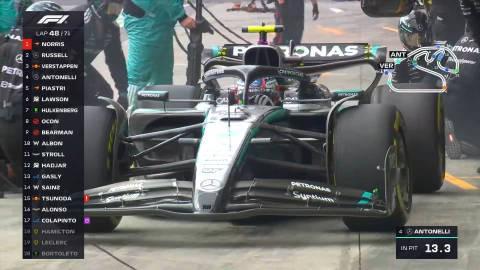 第四十八圈:安东内利从P2位置二停,换上另一套中性胎后出站落在P6
