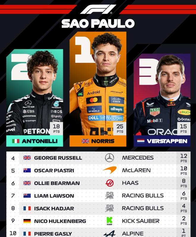 北京时间11月10日,F1巴西大奖赛正赛正式结束。诺里斯杆位夺冠,安东内利第2,维斯塔潘维修区起步拿到第3,拉塞尔第4,皮亚斯特里第5,贝尔曼第6,劳森第7,哈贾尔第8,霍肯伯格第9,加斯利第10。
