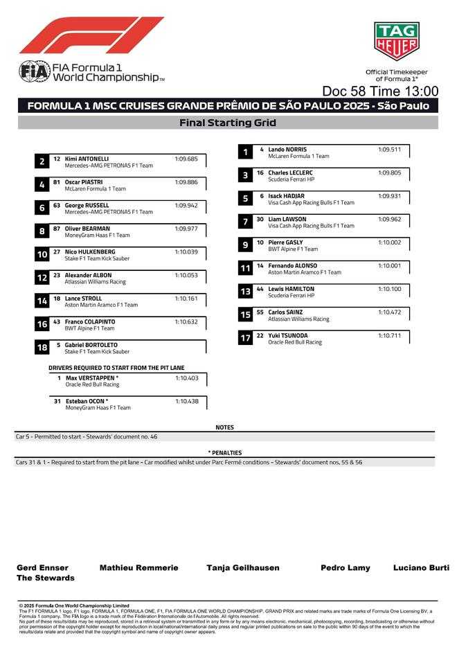 F1巴西正赛:诺里斯杆位夺冠,维斯塔潘维修区起步第3,法拉利双退