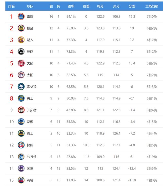 灰熊赢球后2连胜,战绩6胜11负,排名从西部第11升到第10,爵士变成第11,独行侠输球后5胜13负,继续排名西部第13。今日比赛后灰熊、爵士排名互换,其他西部球队排名不变。