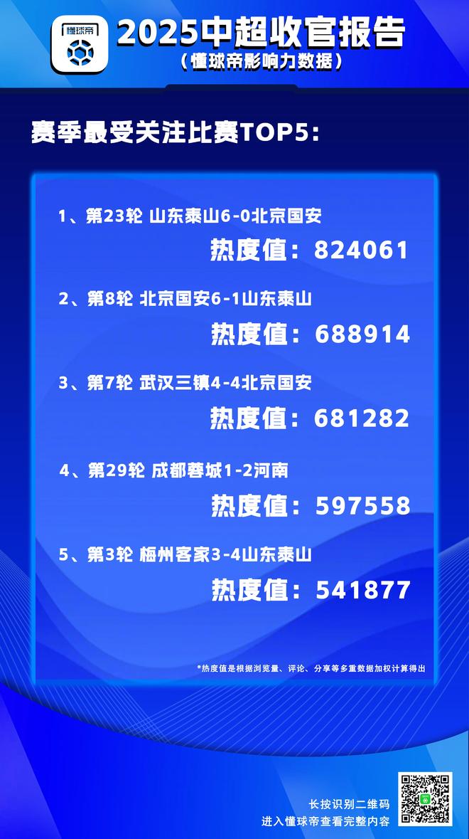此外,北京国安痛失好局被三镇扳平、何超世界波绝杀成都以及山东泰山逆转梅州这三场比赛,也跻身赛季最受关注的比赛TOP5。