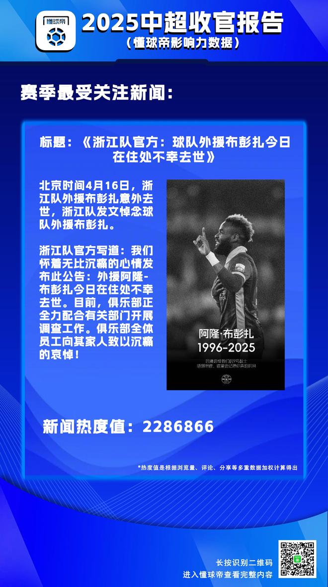在本赛季中超联赛中,最受人关注的新闻是浙江队外援布彭扎去世的新闻。现在我们还记得当时的那个下午,懂球帝编辑部在看到外媒的相关报道时的那种错愕。