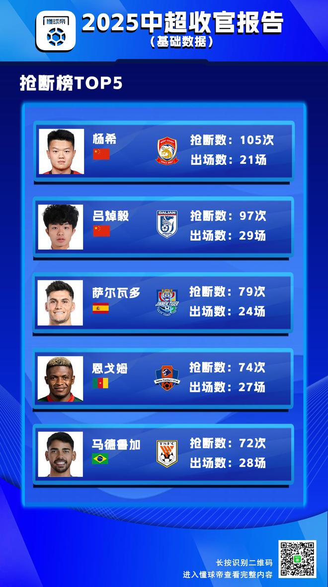 抢断榜TOP5