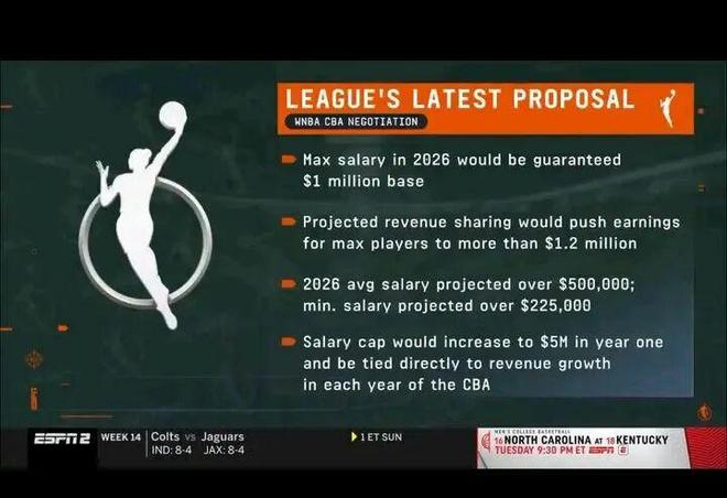 美国女子职业篮球联赛(WNBA),正在进行一场没有硝烟的战争。一年之前,球员工会(WNBPA)选择提前三年跳出现有集体劳资协议(CBA),用一份新合同为未来五年、甚至十年的发展奠定基础。如今,10月31日这个最初的截止日已过许久,联盟和球员工会还未达成协议,谈判桌上更是留下了很多刮痕。截至目前,这一轮劳资谈判已经第二次延期,最新截止日定在1月9日之前。虽然延期,谈判桌下还存有一个「火药桶」:工会和联盟都可以在提前48小时告知对方的情况下,单方面退出谈判。目前看,双方的诉求还有很大差距,关系也已经到了剑拔弩张的地步。如果最终没有谈拢,WNBA将迎来史上首次停摆。那么,WNBA的劳资谈判,为何走到了这一步?问题的根源,是在一个高速发展的联盟中出现了一个主要矛盾——球员日益增长的薪资需求同落后的分配机制之间的矛盾。之前在WNBA总决赛之后,体育产业生态圈曾撰文表示WNBA正在经历,即联盟欣欣向荣的收视率、上座人数、赞助商都在增长,但并没有转化到社媒上讨论与关注度的质变。这种感觉不假,但互联网一直在给我们的上的一课便是,相比互联网上的「火」,更重要的是真金白银。对于WNBA而言,这些真金白银来自实打实的数据。2025赛季,WNBA的平均上座人数达到10,986人,创下历史新高。ESPN公布的数据显示,场均收视人数为130万,是自联盟成立以来的最佳表现。赞助收入上,据《SportsPro》数据显示,联盟及各队目前共有531份商业合作协议,平均每支球队拥有44个合作伙伴,比2022年增长52%。营收数字也同样漂亮。2019年,联盟总收入仅略高于1亿美元;到2023年,已提升至约2亿美元区间。随着两支扩军球队的加盟费,以及即将生效的十一年22亿美元转播合同,WNBA的现金流在未来几年都将维持增长——女子体育整体上扬的大背景下,WNBA未来上涨曲线只会更加好看。因此,球员自然也有底气喊出:联盟赚得更多,我们也理应共享这份成长红利。但问题在于,现行的分配机制并不支持这种增长共享。根据现有劳资协议,WNBA球员的总薪资占联盟收入的比例约为9.3%。联盟实行的是一种「触发式分成」:只有当联盟连续多个赛季每年营收增长20%,才会启动收入分成机制。触发之后,联盟会先扣除30%的运营成本,再将剩余70%与球员平分。听上去复杂,但这个机制从未被触发过。因为疫情让2020、2021赛季的营收严重缩水,联盟至今没能弥补差距。结果是,即使目前的营收增长超过150%,球员拿到的分成依然不到10%。于是,工会提出核心诉求:要建立一个与联盟收入直接挂钩的分成体系。比例不必与NBA持平,但要有实际增长空间——据多方报道,工会提出的目标是30%左右。用球员工会副主席凯尔西·普拉姆的话来说,第一、第二、第三优先都是分成与薪资:「如果我们连去哪个餐厅都没定,讨论点什么菜有什么用?」在上周最新一份提案中,联盟提出的最新方案以大幅涨薪为核心:标准顶薪为100万美元,通过收入分成机制最高可达120万美元;平均年薪大约为50万美元,最低年薪则在22万左右。这些数字,远远高于目前的水平。现在WNBA的底薪、平均薪资和顶薪分别为:6.6万美元10.22万美元、和24.9万美元。图源:ESPN固定薪水的诚意足了,但在分成机制上,联盟仍想要大体维持现有结构,这又与球员的核心诉求存在矛盾。联盟在分成方面的新提案,是收入分成不再与预设目标挂钩。但根据多方报道,比例最高仅能达到14%。在收入分成方面,联盟的表态是:「我们理解球员的诉求,但任何分配机制,都必须建立在联盟财务健康的基础上。」这也是萧华的观点。在此前的一次采访中,NBA总裁亚当·萧华曾公开表示:「她们确实该拿更多钱,但我不认为分成比例是关键,关键在绝对值。」WNBA主席凯茜·恩格尔伯特 图源:clutchpoints为什么萧华要对这个问题发表意见?说到这,有必要讲讲WNBA复杂的资本构成。目前,WNBA由三方组成:NBA有42%的股份,WNBA拿42%,外部投资者拿16%。由于外部投资者和球队的老板基本都与NBA有关,NBA所占的股份最高能达70%,任何事情都能插一手。某种程度上,WNBA新劳资合同的拍板者,是隔壁的萧华,而不是WNBA的主席凯茜·恩格尔伯特。大体上来说,联盟认为营收增长并不等于真正的盈利,而在营收上升且还未盈利时就被分配机制锁死,可能会影响未来发展。从1996年创立至今,WNBA整体仍处在亏损状态。球员工会则觉得联盟「算错了账」。WNBPA董事特里·杰克逊表示球员们要的不是一次性加薪,而是一个能与联盟共成长的机制。前NBA球员工会执行主任塔米卡·特雷马格利奥也指出:「以WNBA当前的营收规模,完全可以承受一个更直接的收入分享结构。」历史经验也显示,盈利并非球员收入分成的前提条件。比如隔壁的NBA,在1960年代多年处于亏损状态,但球员收入占比仍高于如今WNBA水平。1960年代末,即NBA与ABA合并前夕,球员薪资占联盟收入达41%;到1970年代末,这一比例至少达到50%。甚至在1950年代,NBA总收入(2025年通胀之后)仅为现在WNBA的十分之一,却仍拿出约40%来支付球员工资。纵观其他联赛,NBA球员分得联盟「篮球相关收入(BRI)」的49%-51%;NFL、NHL大致维持在50%左右;即便没有工资帽的MLB,球员收入占比也在47%。在女子联盟中,美国女子足球联赛(NWSL)已经实行营收共享制度,将赞助与媒体收入的10%计入球队工资帽。与这些同行相比,WNBA显得滞后。就这样,当谈判双方在核心议题上出现较大偏差时,谈判战线不可避