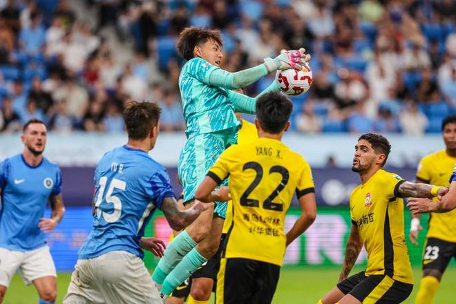 青岛西海岸队守门员李昊(上)在比赛中扑救